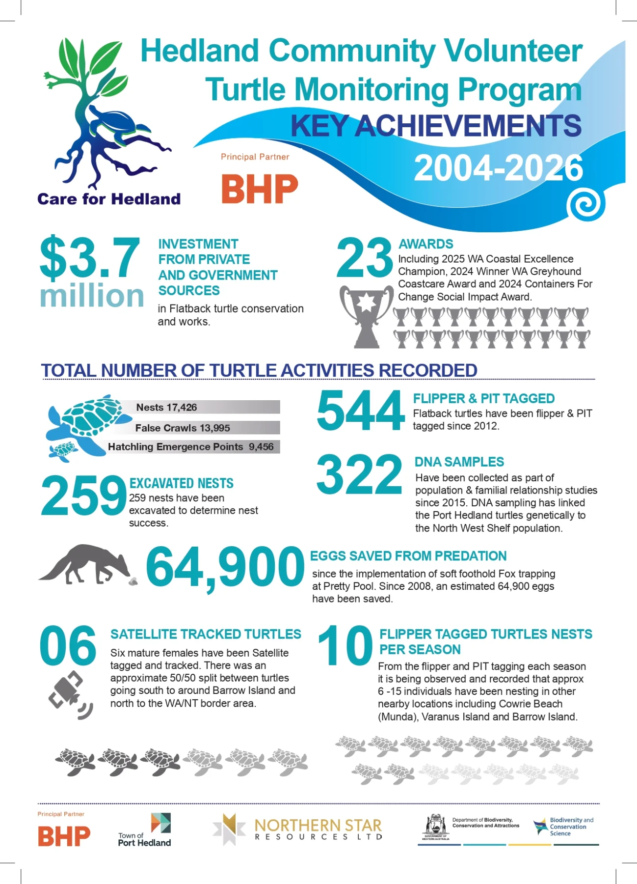 Since 2008, Care For Hedland has been supported by Principal Partner BHP, who support the Morning Coordinator, Evening Coordinator and Evening Guide roles. Department of Biodiversity, Conservation and Attractions (DBCA) support our Scientific Coordinator role.
