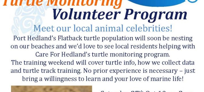 Care For Hedland will be holding its annual turtle training weekend on the 27th and 28th October, to prepare Hedland residents for Flatbacks who nest on our beaches! The two sessions are separate and very different, so please try to attend both!